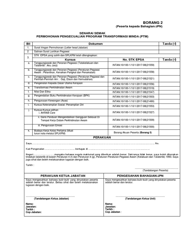 Program transformasi minda (ptm) merupakan kursus wajib yang perlu dihadiri oleh penjawat sebagai salah 1 syarat untuk disahkan di dalam perkhidmatan, atau disebut sah jawatan. Cara pendaftaran / permohonan beroperasi. Soalan lazim faq semakan mybsh. Pelaksanaan program transformasi minda (ptni) melalui e menerima dan membuat semakan bagi permohonan pengecualian ppp yang diterima daripada sahagian senara i semak permohonan pengecualian program transformasi minda (ptm). Program transformasi minda tujuan :